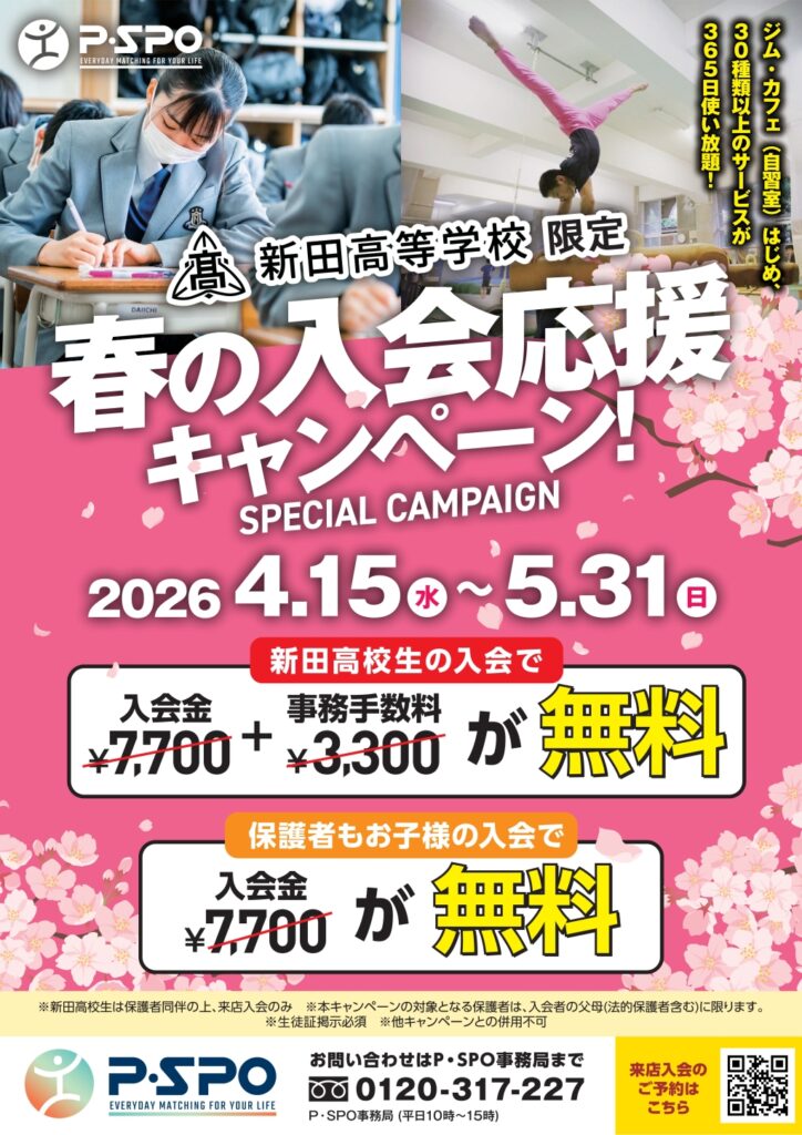 現在P•SPOでは、新田高校の生徒およびその保護者を対象に「春の入会応援キャンペーン」を実施しています。