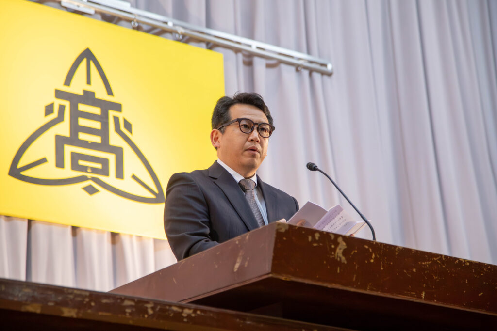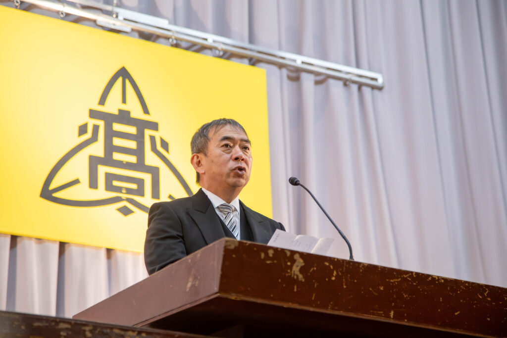 入学式のはじまりに校長先生から入学許可宣言がおこなわれ、新入生は晴れて新田高校生となりました。許可宣言に続いて、校長先生や理事長、PTA会長から祝辞が贈られました。